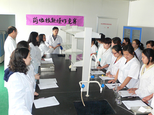 4月29日,藥品檢驗操作技能競賽活動在質量檢驗部舉行。經過稱量、PH值測定,精密量取、定容等環節的角逐,經競賽評委評定,最終評出一等獎1名、二等獎2名、三等獎3名。